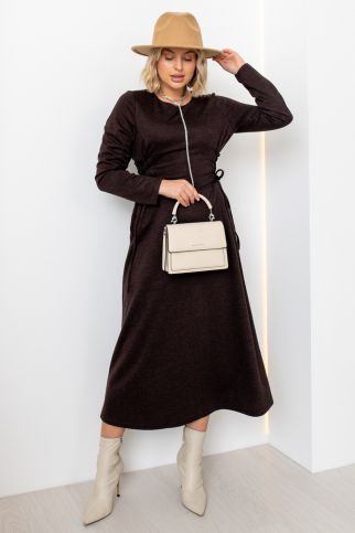 Ткань: трикотажное полотно меланж. Платье отрезное по талии, расклешенное, регулирующиеся завязки на петельках, с боковых сторон по талии. Рукав длинный. Длина изделия ок.123см.