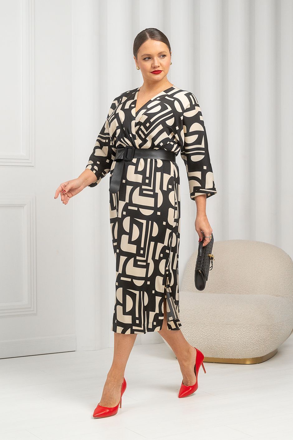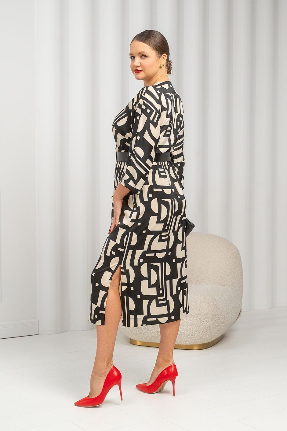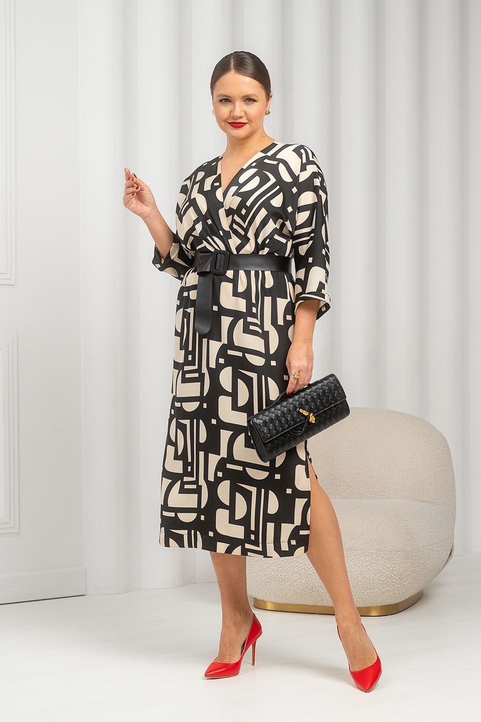 Ткань: искусственный шелк, набивной Платье с цельнокроеным рукавом, спереди вырез запах, под грудью на резине, от линии талии юбка прямого силуэта, сбоку разрез. Рукав 3/4 на манжете. Длина изделия ок. 124см. К платью прилагается ремень.