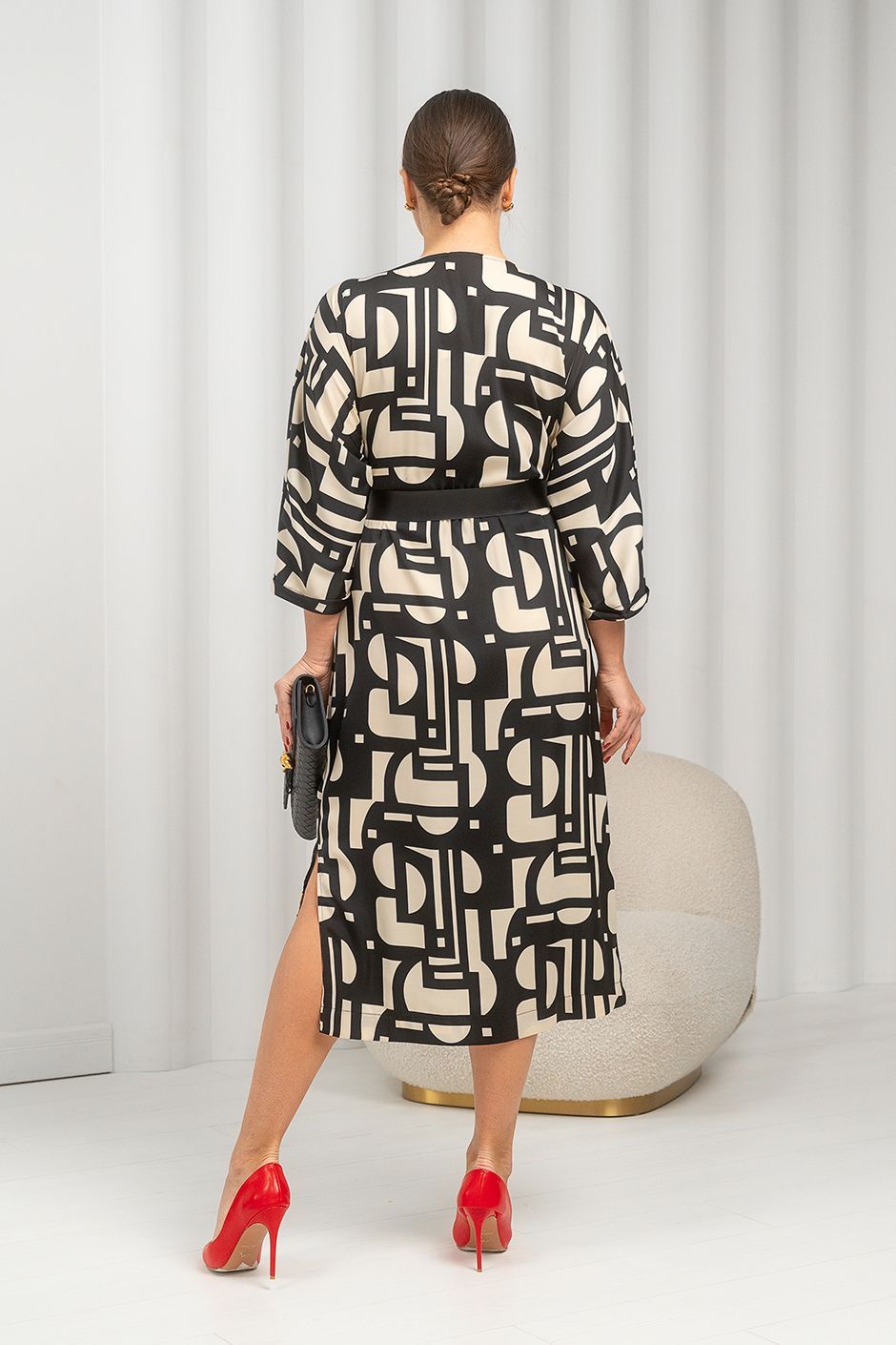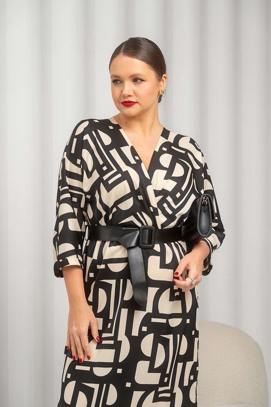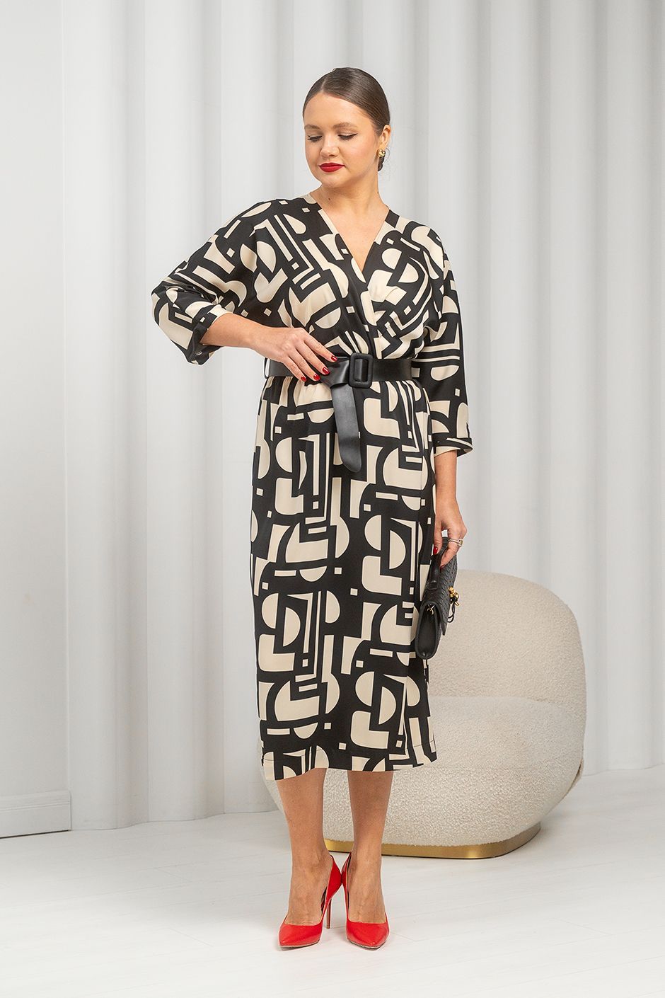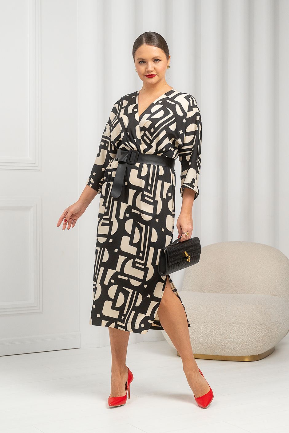 Ткань: искусственный шелк, набивной Платье с цельнокроеным рукавом, спереди вырез запах, под грудью на резине, от линии талии юбка прямого силуэта, сбоку разрез. Рукав 3/4 на манжете. Длина изделия ок. 124см. К платью прилагается ремень.