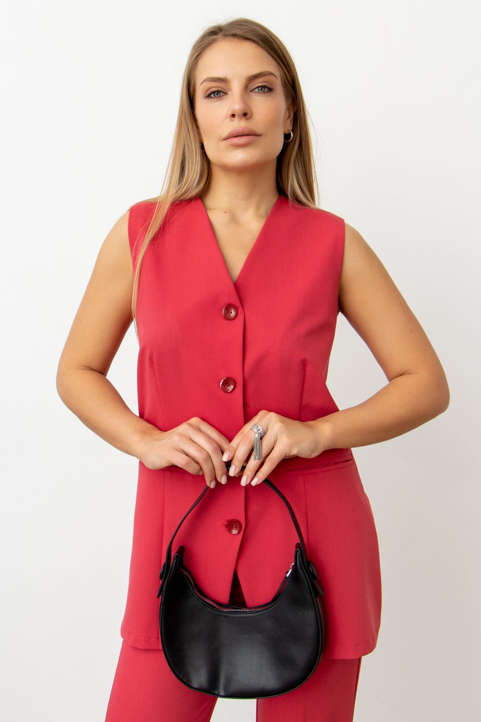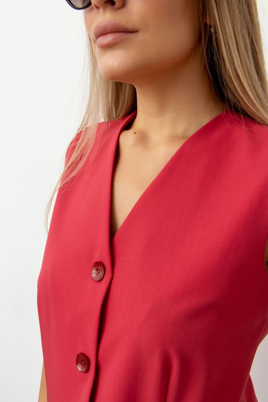 Ткань: костюмная однотонная.Жилет удлиненный, приталенный,  с V-образным вырезом, на пуговицах, сзади хлястик, прорезные карманы, без подкладки. Длина изд. ок. 77 см.