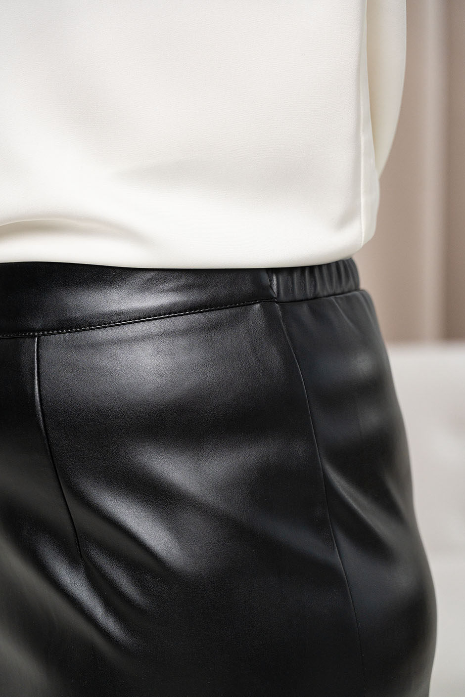 Ткань: экокожа однотонная. Юбка-«карандаш», спереди пояс-кокетка, сзади – пояс на резине, по заднему шву разрез.Длина ок. 60 см.
