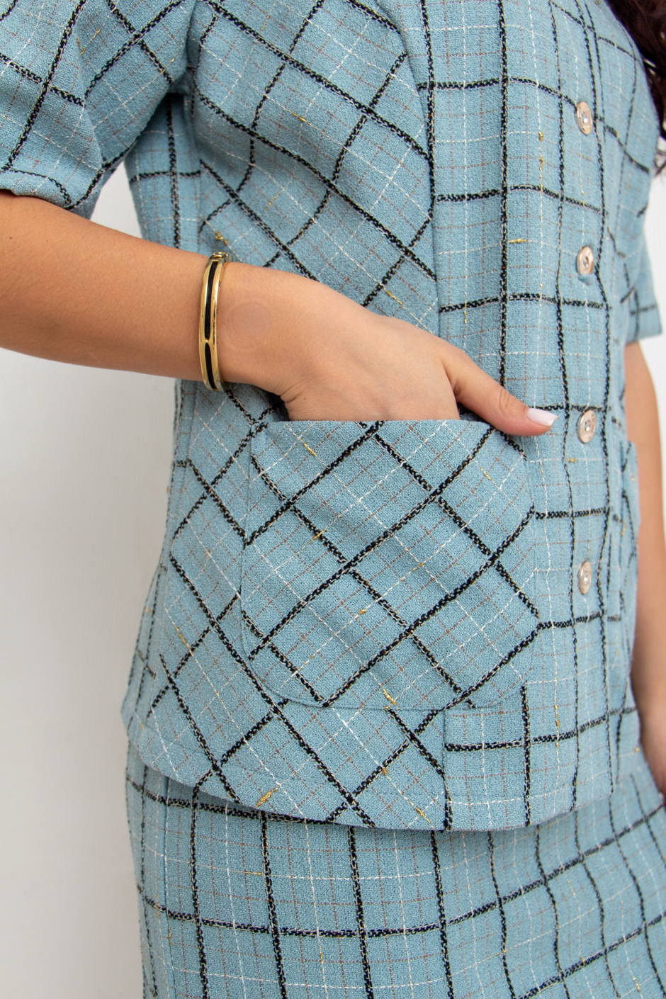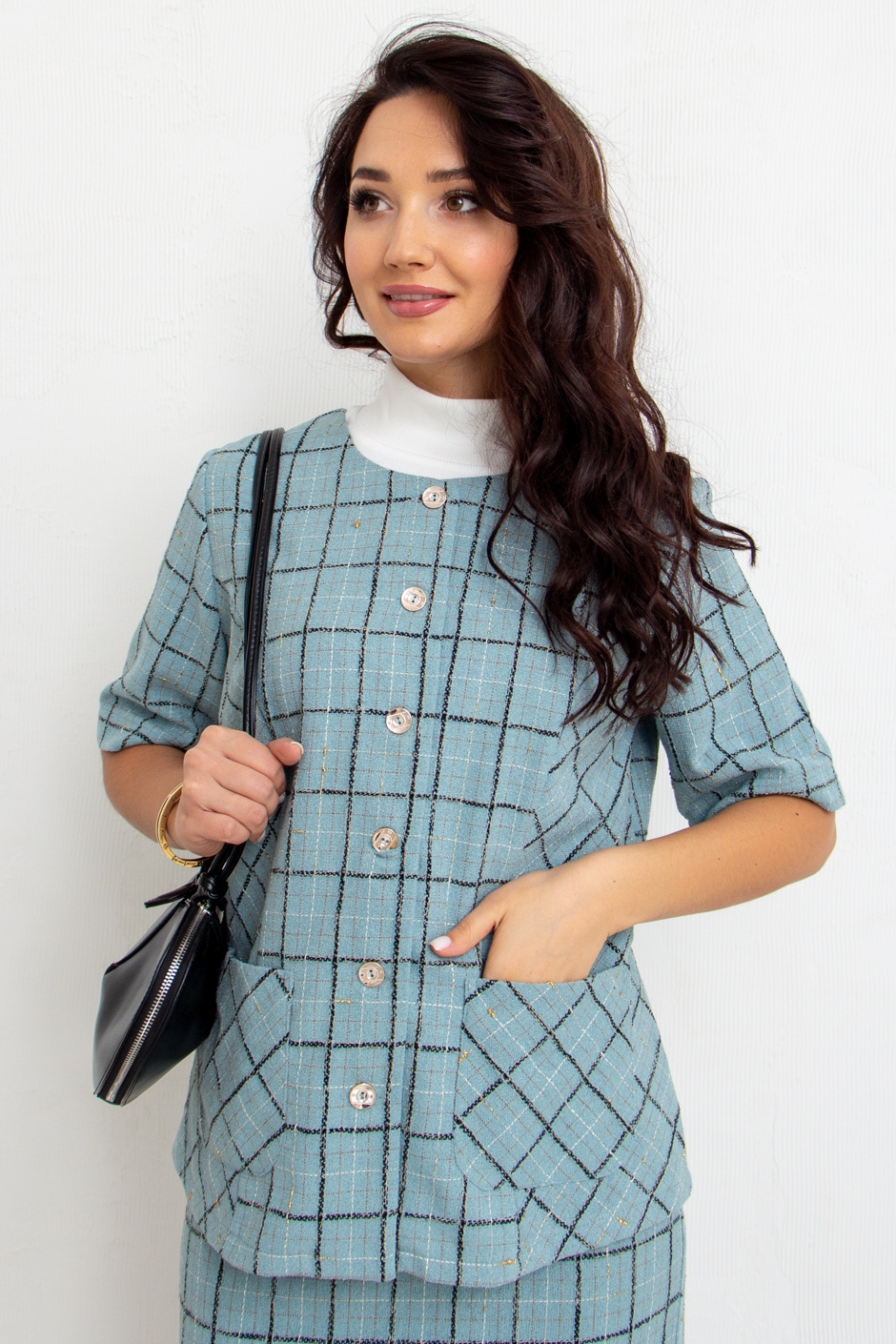Ткань: твид принт клетка с люрексом. Жакет с стиле шанель прямого покроя, с накладными карманами. Длина изделия ок. 60см.