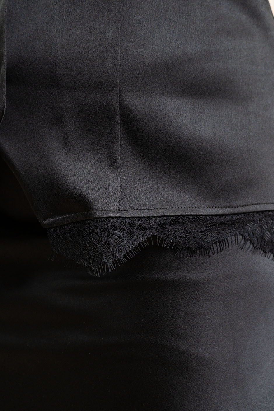 Ткань: атлас-сатин.Жилет  приталенный,  с V-образным вырезом, на пуговицах, сзади хлястик,по низу отделка кружевом. Длина изд. ок. 65 см.
